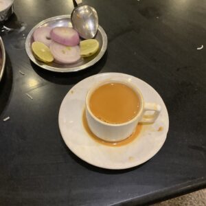 一軒目のビリヤニで「もうビリヤニはいいかな…」という気持ちになったけど、次に日にまた食べた。えらい。次はマトンビリヤニにした。バワルチよりも街中にあり、昔からある食堂の雰囲気だった。バワルチよりもガラムマサラ感があったかな。肉は少なめながら、まあ値段も安いし仕方ないかなという程度。バワルチよりは辛くない。なんとなく、カッチ式ではなく、普通にマトンカレーを作ってから炊き込んでいるような気もする。サランはこっちの方が粘度が低く、好みだった。よく考えたら、バワルチの方が店員さんの感じもレストラン然としていた気がする。しかし、価格はバワルチの方が安く、後発だから値段で勝負しているのか、立地の問題か。ビリヤニに関しては、まあ見たままの味だから言いたいことは少なくて、チャイがおいしかった。何軒か飲んだけど、グランドホテルのが一番好きだった気がする。バンマスカという砂糖とバターが挟まれた、フカっとしたパンがある。すごくうまい。チャイはやっぱりカップから溢れてソーサに落ちている。ソーサに溢れているのはすごくインド的で、つい真似したくなって真似したのだろうなというものを日本人の投稿で見かけることがある。僕の観測した範囲では、適当に注いだものを、驚くほどの雑さで移動させることで、溢れが発生する。だから、必ず飛び散ったような感じになり、カップの縁にも滴がつくことになる。カップに注ぎ、その後ソーサにも注いで溢れを演出すると、一見それらしいけれど、印象としては綺麗になりすぎて、偽物感が出る。もう一つの偽物パターンは、溢れさせるためになみなみと注ぐこと。これは、インドでも注ぐ人の手癖で、注ぎすぎて溢れることもあるのだとは思うけど、見た限りでは、そこまで並々注ぐことはなく、ちゃんと8分目から9分目くらいまでに収めているように見える。注ぎすぎたらオーナーに怒られるだろうしね。とにかく、日本酒よろしく、コップに注いだものが溢れてソーサに落ちていくのではなく、溢れてしまったものがインドのチャイのはず。大事にしよう、必然性。
