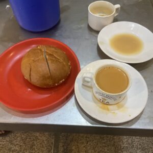 おそらく右側の平たい鍋で牛乳を煮立てて、注文を受けてから、濃く煮出しておいた紅茶とカップの中で合わせるのだと思う。グランドホテルのは、牛乳と紅茶を合わせてさらに煮立たせていたのかも。牛乳は、強く煮立てた、練乳のような味がする。牛乳を煮詰めていくと、色が濃くなってキャラメルみたいな味がしてくる、あれに似ている。手っ取り早くミルクパウダーを使っている可能性もある。甘みはかなり強く、大量に飲むのではなく、ビスケットを浸すための薄めのシロップというような雰囲気。茶葉の味は、ある程度しっかりするものの、渋みはそこまで強くない。家で再現しようとすると、牛乳の味が変化するまで煮立てると、どうしても牛乳の成分が固まって湯葉のような破片ができてしまうので、どうにか解決したい。ちゃんとヘラでかき混ぜると固まりにくいのだけど、果たしてインドのチャイ屋がそこまで面倒なことをするのだろうか。動画を漁ると、牛乳を濾してしまっているところもある。すごく勿体無い感じがするぞ。