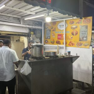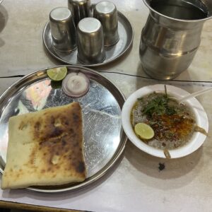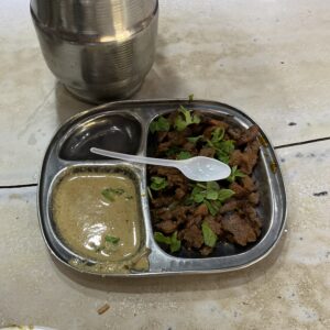 ムスリム濃度が高めの店で、女の人の姿はない。細長い日本人が来たのを認めると、じろっと見て、ふんっと席を示す、標準的なインドの食堂。全然いやな感じはしない。ハリームは肉が少なめで、滑らかではあったけど、力だでる感じの味ではなかった。ちゃんと作ったハリームは、食べると体に何かがみなぎる感じがする。カロリーか。ピークタイムを外したせいか、タラワゴシュトはおいしくなかった。しょっぱくて乾燥していた。まあ、こんなものか。多分出来立てならおいしいのでしょう。本当はパヤを食べようと思っていたのだけど、埃っぽい軒先に、煮られた肉が並べられているのを見て、回避した。掃除のおじさんが、ざあっざあっと箒で掃いている。その先に肉がある。四角いナン、もっと質実剛健みたいな味なのかと思ったら、ショートニング?ベーキングパウダー?みたいな、フカっとしたもので拍子抜けした。パオバジのパンと同じ文化を感じた。デリーとかなら違うのかな。