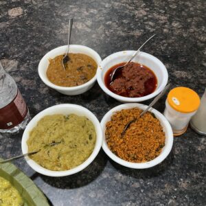左上から時計回りに、チリとチャナ(レッドチャトニだね)、ニンニク(だったかな?)、ポディ、瓜のパチャディ。全部しょっぱい